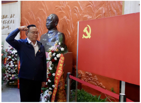 在滕代远纪念馆,集团党委书记、董事长杨秀和带领全体党员怀着崇敬的心情向滕代远同志铜像鞠躬致敬并献上花篮,面对鲜红的党旗重温入党誓言,并在讲解员的带领下,通过文字、图片、文物等全面了解滕代远同志为新中国的建立和社会主义建设奋斗的艰辛历程,感受老一辈无产阶级革命家艰苦奋斗的光荣历史和丰功伟绩。